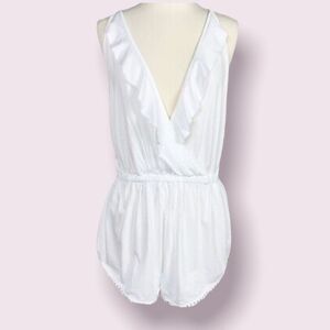 Topshop white jersey wrap cover-up romper. Soft, lightweight jersey with pompom-crochet trim. Elastic waist and a ruffle plunging neckline to show off your swimsuit. Surplice neck. Thin straps with back tie.
