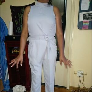 Light grey jumpsuit with faux belt, clasp open back..side pockets..