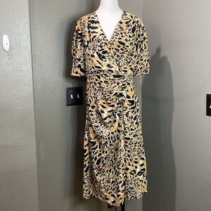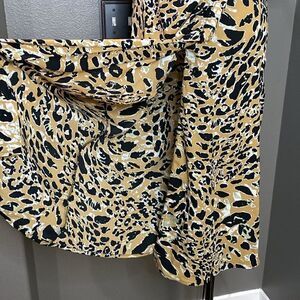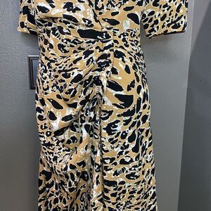 Make the day wild in this leopard-print dress that's slit up the thigh and puckered down the hip with pleats. More pleats at the shoulders and short sleeves lend interesting drape to this sassy look.