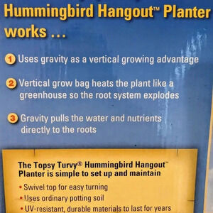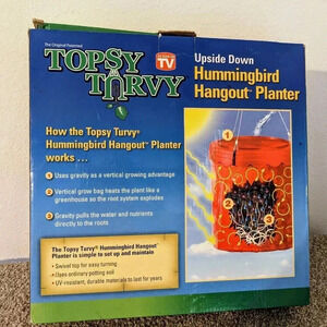 New in box Topsy Turvy Upside Down Hummingbird Hangout Planter. Creates a natural hummingbird habitat. This innovative planter allows you to hang it on your deck, balcony, or patio, and grow abundant nectar flowers all season long. It is designed to save time, space, and effort, and it utilizes gravity as a vertical growing advantage. The vertical grow bag heats the plant like a greenhouse so the root system explodes, and gravity pulls the water and nutrients. The planter is simple to set up and maintain, featuring a swivel top for easy turning, uses ordinary potting soil, and is UV-resistant and durable. Perfect for gardening enthusiasts who enjoy attracting hummingbirds and butterflies to their outdoor spaces, this planter would be ideal for creating a vibrant display on a porch or in a sunny garden nook.