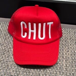 Bold red trucker hat with CHUT lettering. Stylish and eye-catching.