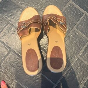 Vintage-inspired brown leather mules with a stacked wood-look heel and silver buckle detail. These slip-on heels are ultra comfy with a curved footbed and padded sole. Made in Spain by Toral, known for quality and unique design.
