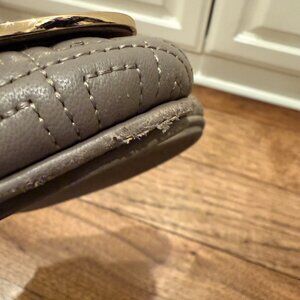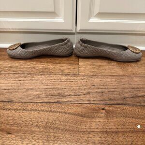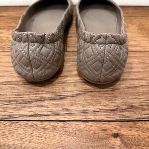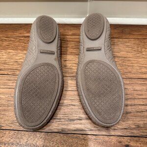 These are gray-beige ballet flats. The leather has a diamond pattern stitched in it. The logo is on the front in gold. There is scuffing on the toe of the the sole of one of the shoes. I have this photograped.