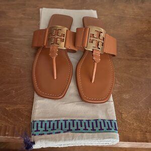 Elegant leather thong sandals. Features classic Tory Burch design in gold. Perfect for casual wear or dressing up.