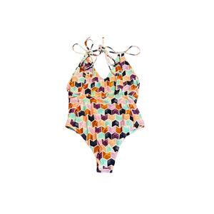 retro swim, geometric print, resortwear, beach style, boho vacation, 70s revival, colorful swimwear, surf chic, Hawaii style, quiet luxury resort, poolside chic, designer swim, pastel print, tie back swimsuit, one piece, spring break, coastal style, giftable
