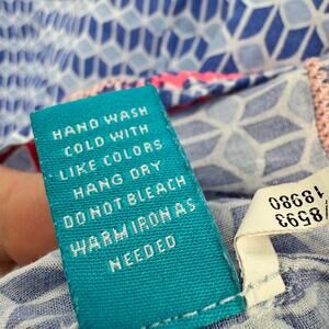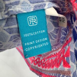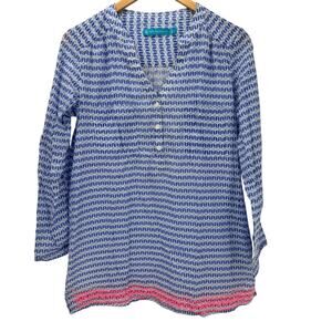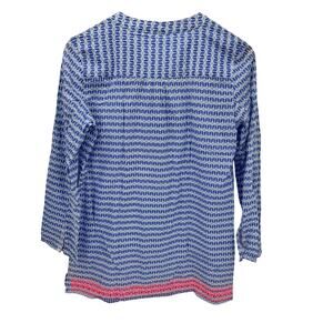 Tori Richard Blouse Womens Small Coastal Blue Pink Geometric Popover Long Roll Tab Sleeves 100% Cotton Tunic