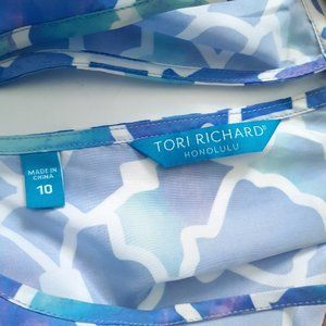 Very good pre-owned condition. Tori Richard Blue Print Trapeze Sleeveless Top. Size 10. 100% polyester. Machine wash. Several shades of blue with white in print.