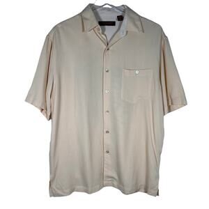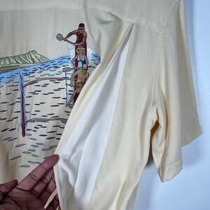 Tori Richard Honolulu Classic Embroidered Oahu Outrigger Button Down Shirt L Silk Blend. Light butter yellow color.