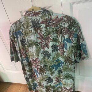Button-down cotton shirt with palm fronds in green, brown and blue. Cotton machine washable size XL. The button-up design kicks it up a notch in case you want to wear it to dinner, side vents keep things nice and breezy, and to top it all off, the chest pocket stores anything you need to keep handy. Lying flat it measured 22" pit to pit. Smoke free home.