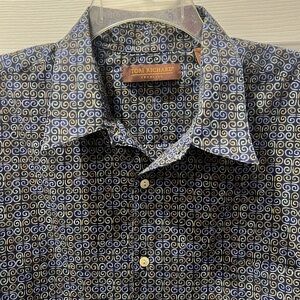 High end button front casual shirt. Classy scroll print. Straight hem with slit. Hard to see, but there is a front pocket. Freshly laundered and ready to wear! P2P 251/2”