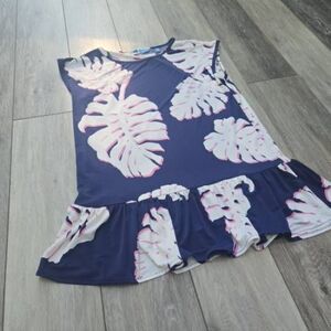 Brighten up your wardrobe with this Tori Richard Honolulu tunic, crafted in the USA! This sleeveless shirt features a playful navy background adorned with vibrant pink and white leaf prints that scream summer vibes. The stretchy fabric ensures all-day comfort, while the flirty ruffle at the hem adds a touch of fun. Perfect for beach outings or casual brunches. Make an offer!