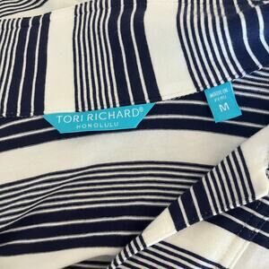 Beautiful dress by Tori Richard Honolulu in the Jaxon style and in a navy & white striped print. Tag size Medium. In excellent preowned condition. Approximate measurements: Chest - 18.5" Waist - 17.5" Length - 35"