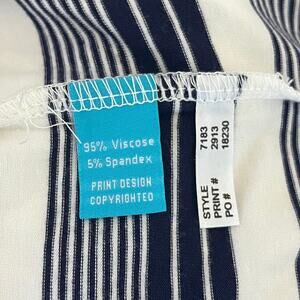 Beautiful dress by Tori Richard Honolulu in the Jaxon style and in a navy & white striped print. Tag size Medium. In excellent preowned condition. Approximate measurements: Chest - 18.5" Waist - 17.5" Length - 35" Details - Spread collar - Split neck - Short sleeves - 2 front pockets - Made in USA Fiber Content - 95% rayon, 5% spandex