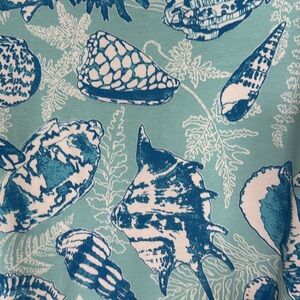 Tori Richard Sea of Love Kennedy shades of blue sea shell print short sleeve T shirt midi. Slightly flared skirt. Small left chest pocket. Cotton/polyester/spandex blend. NWT. Size XL. Armpit to armpit approximately 22 inches. Shoulder to hem approximately 38 inches. Nonsmoking home.