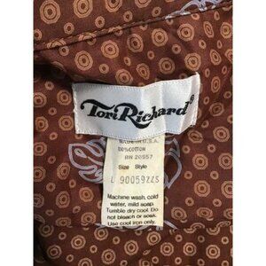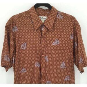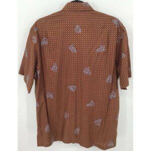 A men's size large shirt from Tori Richard. The shirt is in shades of brown with a geometric pattern. The shirt is vintage, button down style, collared, short sleeves, chest pocket, Aloha and is in excellent pre-owned condition.
