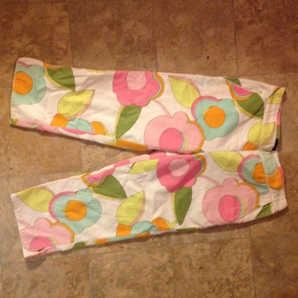 These are a fun, tropical look pant, 100%cotton. They are size 8 but found they ran a little small at the waist.