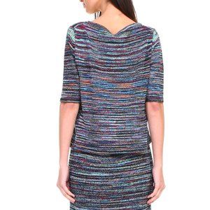 Our Tori top made beautifully with light weight tweed knit. Super soft and comfy. Round neck. Elbow length sleeves. Relax easy fit. Stylish and timeless. Multi-colored. Pair this top with the matching Tatiana skirt. Perfect for all occasions.