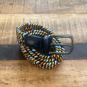 Stylish braided belt featuring a mix of blue, yellow, and orange colors. Accented with a silver buckle.