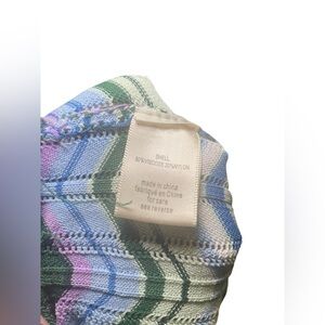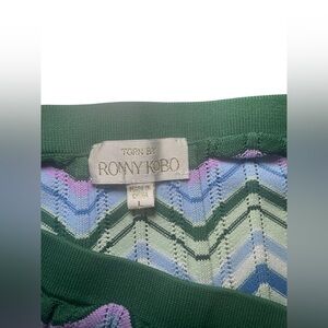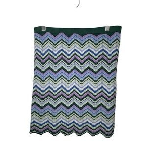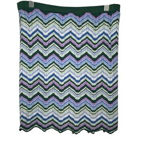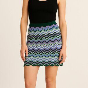 Torn By Ronny Kobo green chevron knit mini skirt in size large. This eye-catching skirt features a vibrant zigzag pattern in shades of green, purple, and blue. Crafted from a soft stretch knit, it has a flattering silhouette with a comfortable waistband and a subtle scalloped hem. Skirt is unlined.