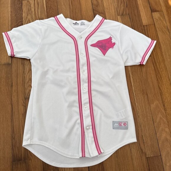 This product is a Toronto Blue Jays Majestic jersey in pink, designed for girls in size XL. It is a baseball jersey that is part of the Major League (MLB) and is ideal for wearing during the regular season games. Made by a reputable brand like Majestic, this jersey represents the Toronto Blue Jays team and is perfect for female fans looking to show their support while cheering on the team.