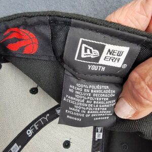 Black baseball cap with red and white Raptors logo in embroidered script. NBA patch on the back. Youth size with adjustable snap back band.