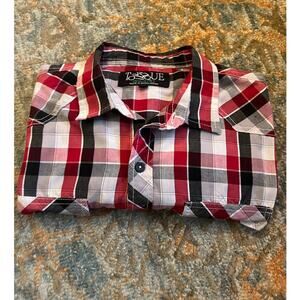 This is a men’s long sleeve button-up shirt by Torque Industry in a bold red, black, gray, and white plaid pattern. Size: Large (L). Style: Casual / Western inspired. Long sleeves with button cuffs. Two front chest pockets with button flaps. Lightweight woven fabric - 60% cotton/40% polyester. Chest (pit to pit): 22". Shoulders (across back): 17:, Sleeve length: 25". Front length: 28". Back length: 31.5". Condition: Pre-owned, gently used, clean with no rips, stains, or holes.