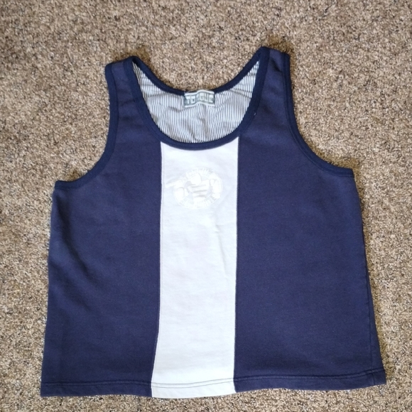 Men's vintage Torque brand blue and white terry cloth tank top. Has "Torque Blue + White" white on white logo on the front. Good vintage condition. No size tags. Fits Size Small. Approximate flat measurements: Chest - 20¼ inches, Length from Shoulder to Hem - 23½ inches.