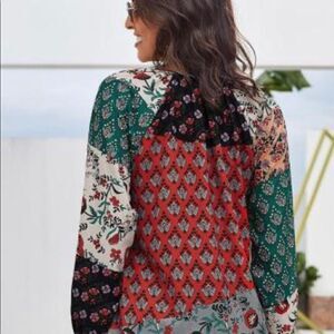 Multicolor floral print peasant top, fitted with a split neckline, long billowed sleeve & elastic hemline, micro pleating along neckline, relaxed silhouette, different prints, trendy!