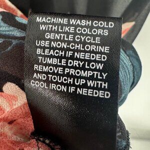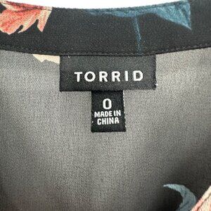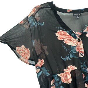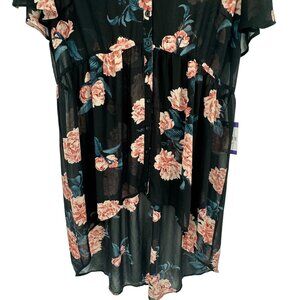Torrid 0 Short Sleeve Button Up Sheer Tunic Top Black Floral High Low Hem Vneck