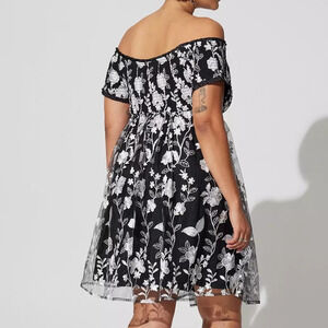 Torrid 00 (size 10) Black Floral Embroidered Smocked Off Shoulder Cocktail Dress
