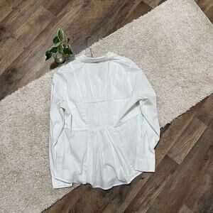 White, button down, corset detail, long sleeve, smocked back, poplin woven fabric