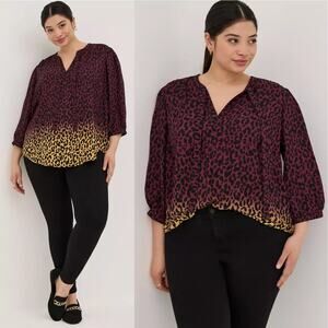 Torrid 1 (1X) Ombre Leopard Georgette Secretary Tie Neck 3/4 Sleeve Blouse Top