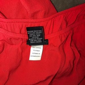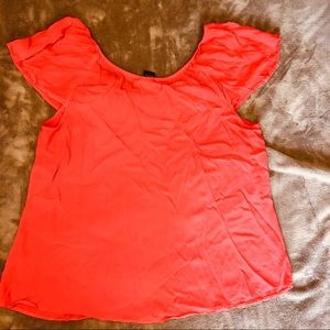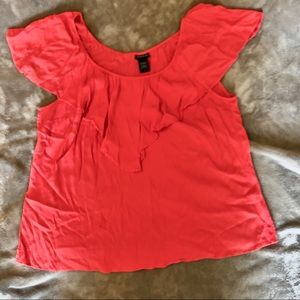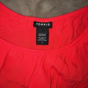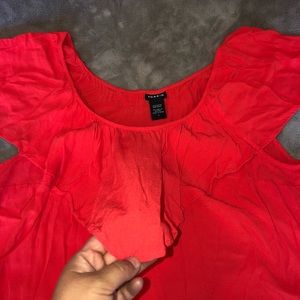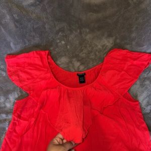 Bright Coral Color Torrid Top, 100% Rayon, Elongating Front V Shape Ruffle -detail covers upper arm