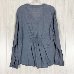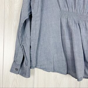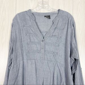 Lightweight Chambray blouse with pleated front. Long sleeves and button down v-neck design. Perfect for casual or office wear. Fit is a flattering 2X or a loose fitting 1X. Very minimal stretch if any but has a flared bottom hem.