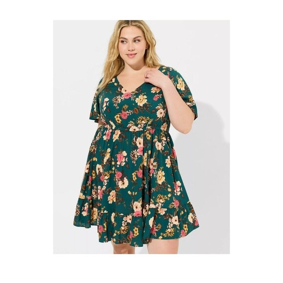 The Torrid 2 Dress in Real Green Floral Challis is a stylish and versatile piece perfect for various occasions such as weddings, parties, or casual outings. The A-Line silhouette with a corset back and tiered skater design offers a flattering fit for plus-size women. Made from polyester and rayon fabric, this short dress features a V-neckline, short sleeves, and a pullover closure for easy wear. The whimsical floral pattern and cottagecore aesthetic make it a charming choice for the summer, fall, and spring seasons, bringing a touch of bohemian and retro vibes to your wardrobe.