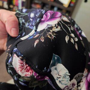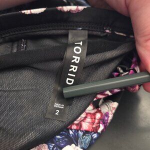 Torrid size 2 Underwire Push-up Cute and Sew Bikini Top in black purple floral pattern. Size equivalent is 2X, 18-20, underbust 38”-42”, cup range D-DD. Top has underwire and is lightly lined, but not padded, with convertible and adjustable straps, mesh lining, and side boning. 80% nylon, 20% spandex. Gently used with light signs of wear, but overall still looks great! NOTE: I have a matching swim skirt listed as well if interested, but it’s a different size (3).