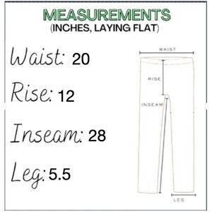 * Waist: 20" - Rise: 12 " -Inseam: 28" - Leg Opening: 5.5"