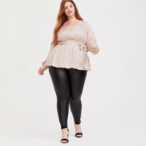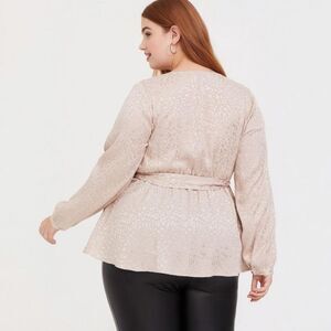 Elevate your wardrobe with this stunning Torrid wrap blouse. Featuring a shimmering champagne leopard jacquard design, this silky long sleeve top flatters with a surplice neckline, stretchy fit-and-flare waist, and removable self-tie sash belt. The slightly curved hem and luxe drape make it versatile for work, date night, or special occasions.