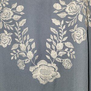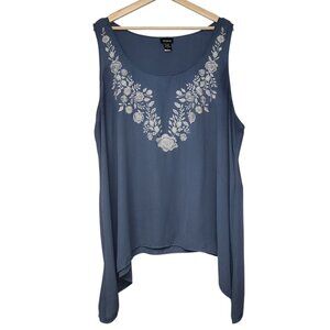 Torrid georgette sleeveless blouse. Steel blue with white floral embroidery. SharkBite hem. Wear on its own in warm weather. Add a cardigan, blazer or jacket when cooler. Pre-owned in excellent condition.