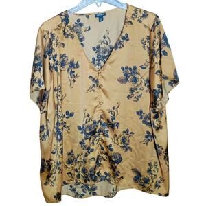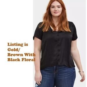 Torrid 3, Women 3x Brown/ Gold Hue with Black Floral/ Rose Pattern-- V-neck, Short Sleeve, Faux Button Front, Hammered Charmeuse Fabric, Lightweight Top