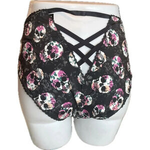ITEM: Torrid +4 Black Floral Skull Print Scallop Lace Waistband Caged Back Hipster Panties