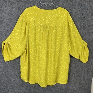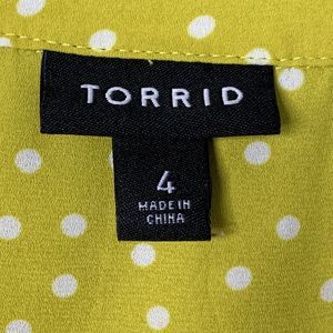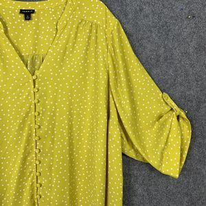 This Torrid button-up blouse is a must-have for any fashionable woman's wardrobe! The bright chartreuse yellow color with playful polka dots is sure to turn heads. The blouse features covered buttons and three-quarter sleeves for added style. It is a size 4X and is perfect for any occasion, from a day at the office to a night out on the town. Don't miss out on this trendy piece!