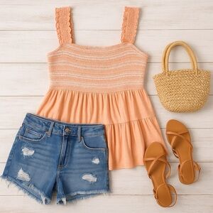 This flirty peach Torrid blouse is summer-ready! Smocked bust, ruffle straps, and a soft, swingy tiered silhouette in a breezy cotton/modal blend. Perfect with denim or wide-leg pants.