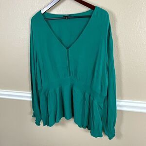 Torrid 4 Solid Emerald Green Gauze Top Smocked Peplum Midi Blouse Long Sleeve R3