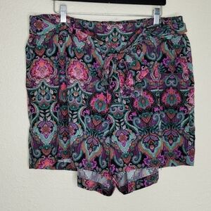 A vibrant damask print and front pockets keep these crepe woven tie-front shorts high on the summer style favorites list.