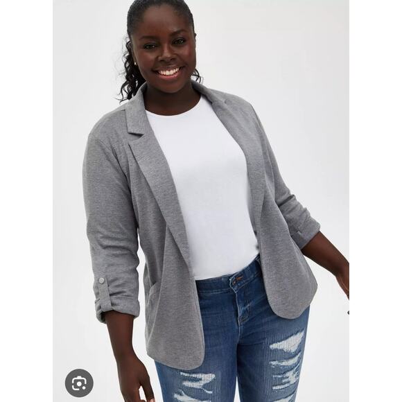 Torrid 5 Women 5x Plus Size Gray Knit Jersey Roll Tab Sleeve Flowy Blazer Jacket