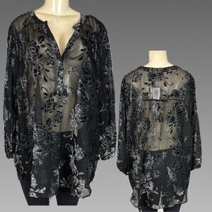 ITEM: Torrid +6 Black Sheer Burnout Floral Split Button Neck Curved Hem 3/4 Sleeve Blouse