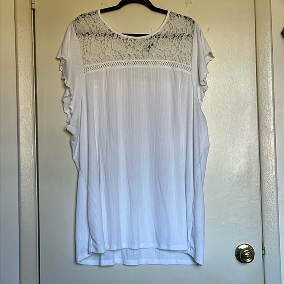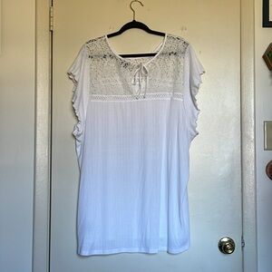 White t shirt with lace front and back panel, tie back, flowy cap sleeves, like new