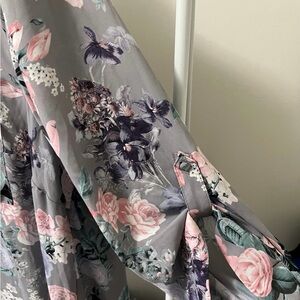 Elegant floral blouse with long sleeves. Features a mix of pink, green, and gray tones.