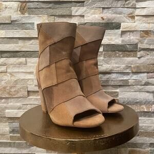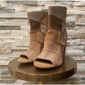 Torrid 7W Patchwork Heeled Booties | Leather Upper, Peep Toe, Neutral Suede